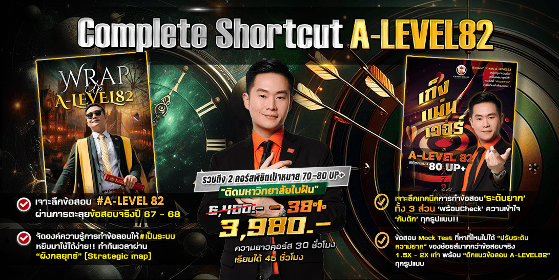 สำหรับน้องๆ ที่เคยเรียน Wrap up A-LEVEL82 75 UP+ มาแล้ว หรือเคยเรียนคอร์สอื่นๆ ของครูพี่โอมมาก่อน และรู้สึกว่าตัวเองมีพื้นฐานอยู่บ้างแล้ว แต่ยังไม่มั่นใจ 100% ว่าจะพร้อมสำหรับการสอบ A-LEVEL82 จริงๆ คอร์สนี้คือคำตอบ! เพราะคอร์สนี้ถูกออกแบบมาเพื่อเป็น "จุดจบ" ที่สมบูรณ์แบบสำหรับน้องๆ ที่ต้องการ "พุ่งทะยาน" คะแนน A-LEVEL82 ไปถึง 80 UP+